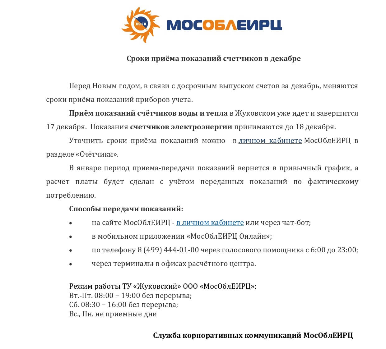 Прием показаний счётчиков воды и тепла в большинстве городских округов начался 1-го декабря. В зависимости от территории и управляющей организации сроки передачи показаний могут отличаться. В Жуковском передать показания приборов учета рекомендуется до 15 декабря. Если показания будут переданы позднее, начисления за декабрь рассчитают по среднемесячному объему потребления, а в январе на основании актуальных показаний будет выполнен перерасчет.