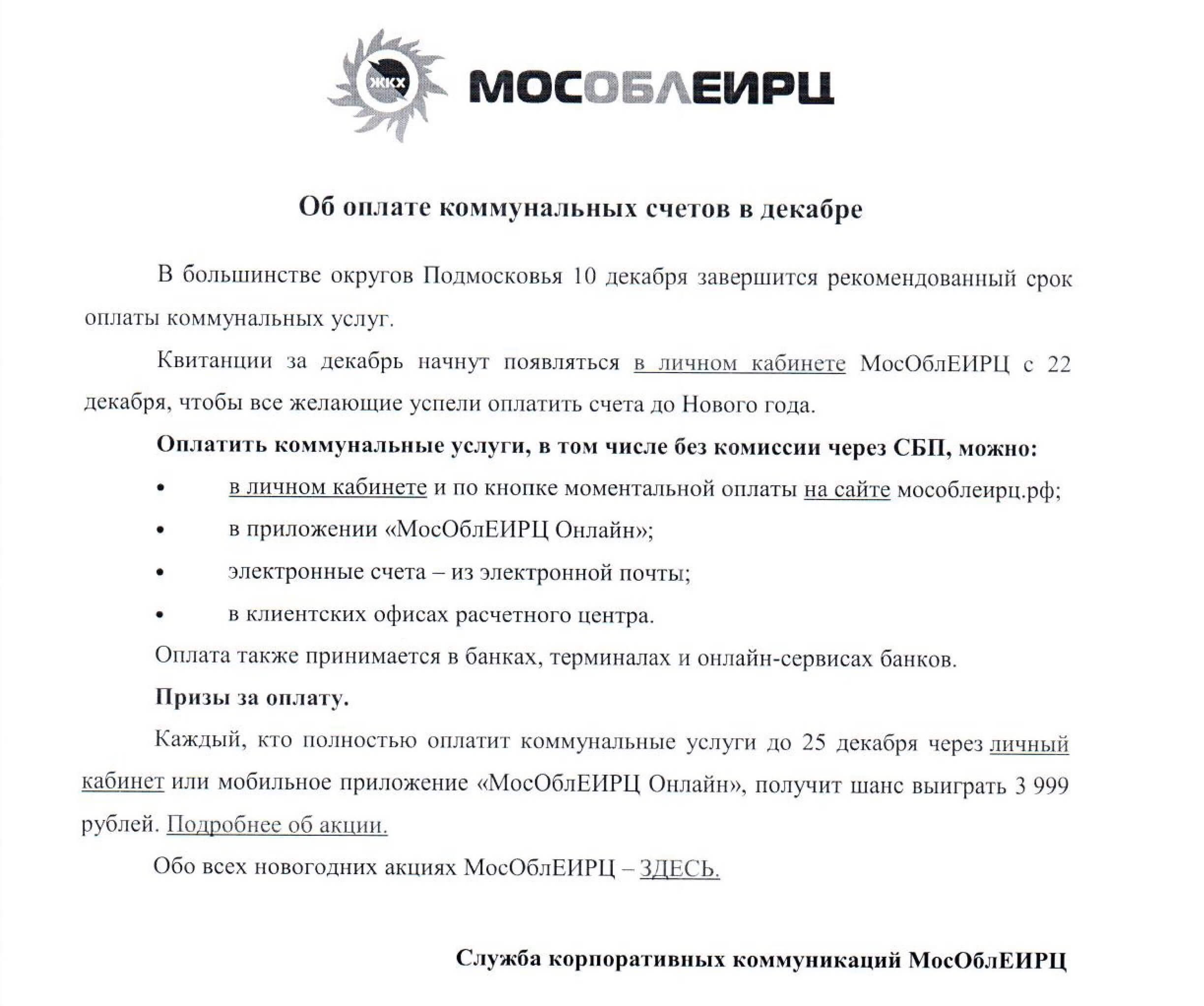 Как выиграть призы за оплату. Каждый, кто полностью оплатит коммунальные услуги до 27 декабря через личный кабинет или мобильное приложение «МосОблЕИРЦ Онлайн», получит шанс выиграть 3 999 рублей. Подробнее об акции «Выигрывай с умной платежкой» можно узнать на сайте МосОблЕИРЦ.