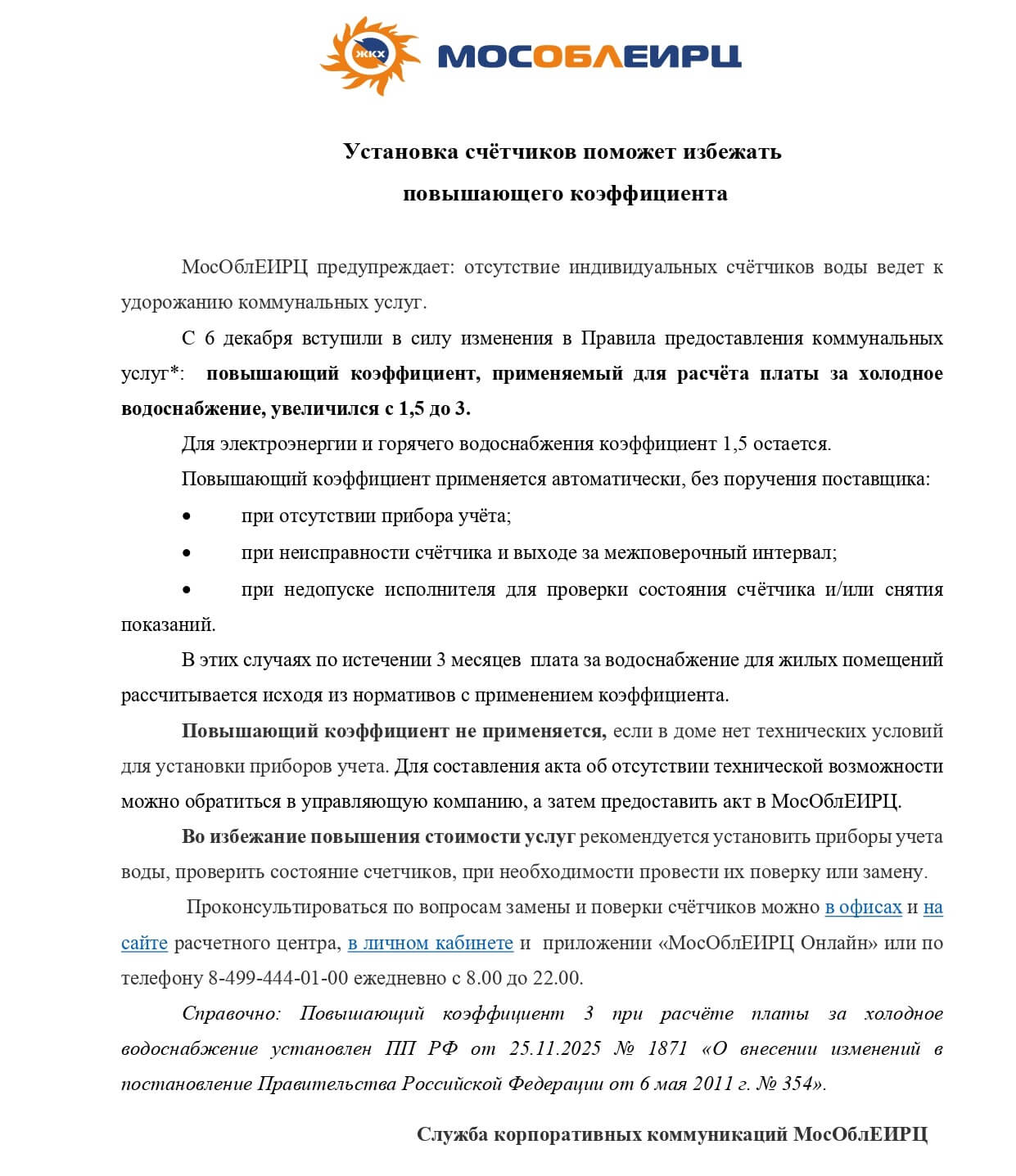 Жителям домов, где поставщиком электроэнергии является АО «Мосэнергосбыт» и услуга включена в состав единого платежного документа, передать показания приборов учета электроэнергии рекомендуется с 15 до 18 декабря включительно. Начисления за электроснабжение жителям, которые получают отдельную квитанцию по оплате электроэнергии, в декабре 2024 будут произведены без учета показаний исходя из среднемесячного объема потребления или по нормативу. В следующей квитанции будет произведен перерасчет платы с учетом январских показаний приборов учета.